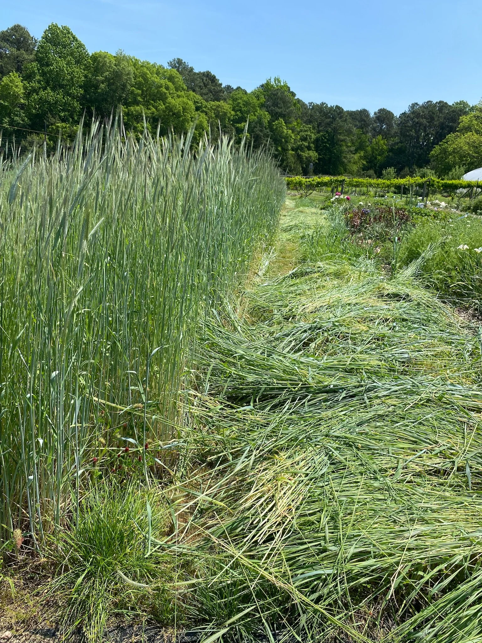 Rye that served as cover crop over the winter gets mowed in the spring and left to dry as natural mulch.